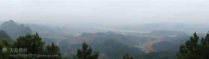 沿着崎岖的山路深入山中,沿途静悄悄的,偶尔才碰到几个人。绕着盘山小路走了两个小时终于到达古亭山庄及电视塔大门,门票3.5元。一直登上观景亭及电视塔底,用GPS实测山顶经纬度为:24°19′35.57″N,109°30′45.16″E,海拨高度为557米。远眺山下景色,千峰叠翠,曲水环流,雾霭缭绕,凉风习习,花香扑鼻,惬意极了。可惜阴天能见度较差,雾茫茫的,拍出来的照片不太清晰。